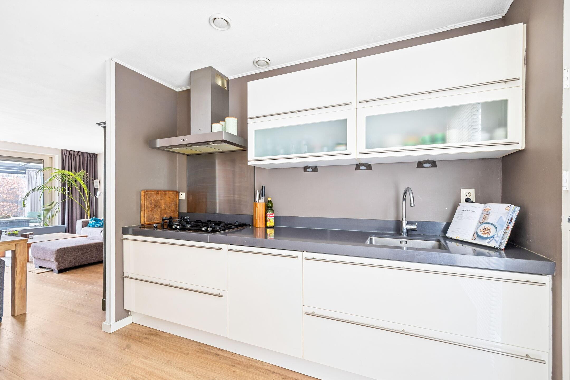 De woonkamer loopt op natuurlijke wijze over in de keuken. Die is slim tegen de beide wanden geplaatst, waardoor -in combinatie met het grote raam – een open karakter ontstaat en er veel bewegingsruimte overblijft. U beschikt hier over een langgerekt composiet werkblad, een vijfpits gasfornuis en brede laden plus bovenkasten met veel bergruimte. Het wandelement is bestemd voor inbouwapparatuur en extra bergmogelijkheden.