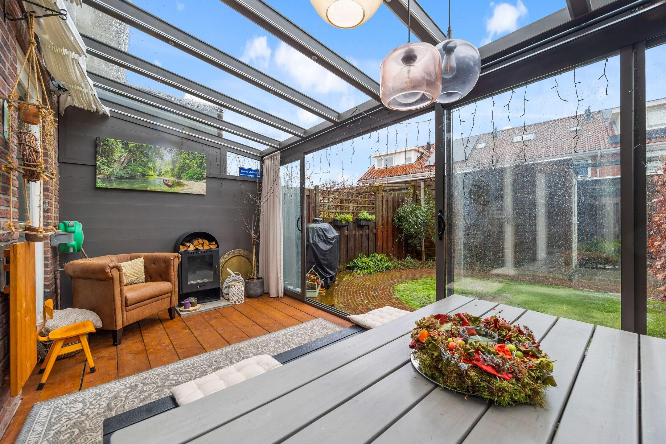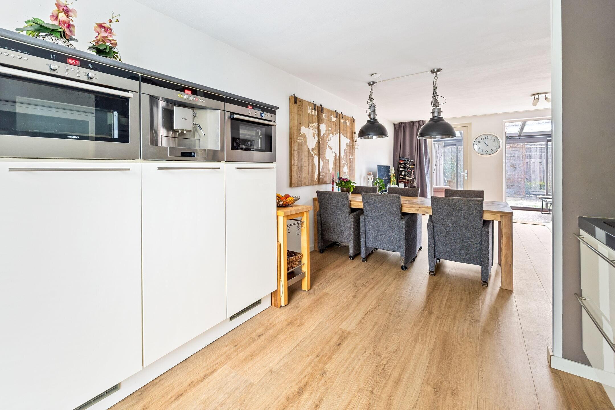 In de gezellige woonkamer valt meteen op dat er achter de glazen schuifpui een extra ruimte is aangebouwd. Dit is de tuinkamer, gebouwd over de gehele breedte van het huis en voorzien van een aluminium schuifpui. Bij het openzetten ervan maakt u het huis onderdeel van de tuin en bij het afsluiten haalt u het buitengevoel naar binnen. Stelt u zich maar eens voor hoe fijn het is om hier in de koudere maanden te kunnen zitten; altijd licht, het knusse gevoel van een haard in de hoek…