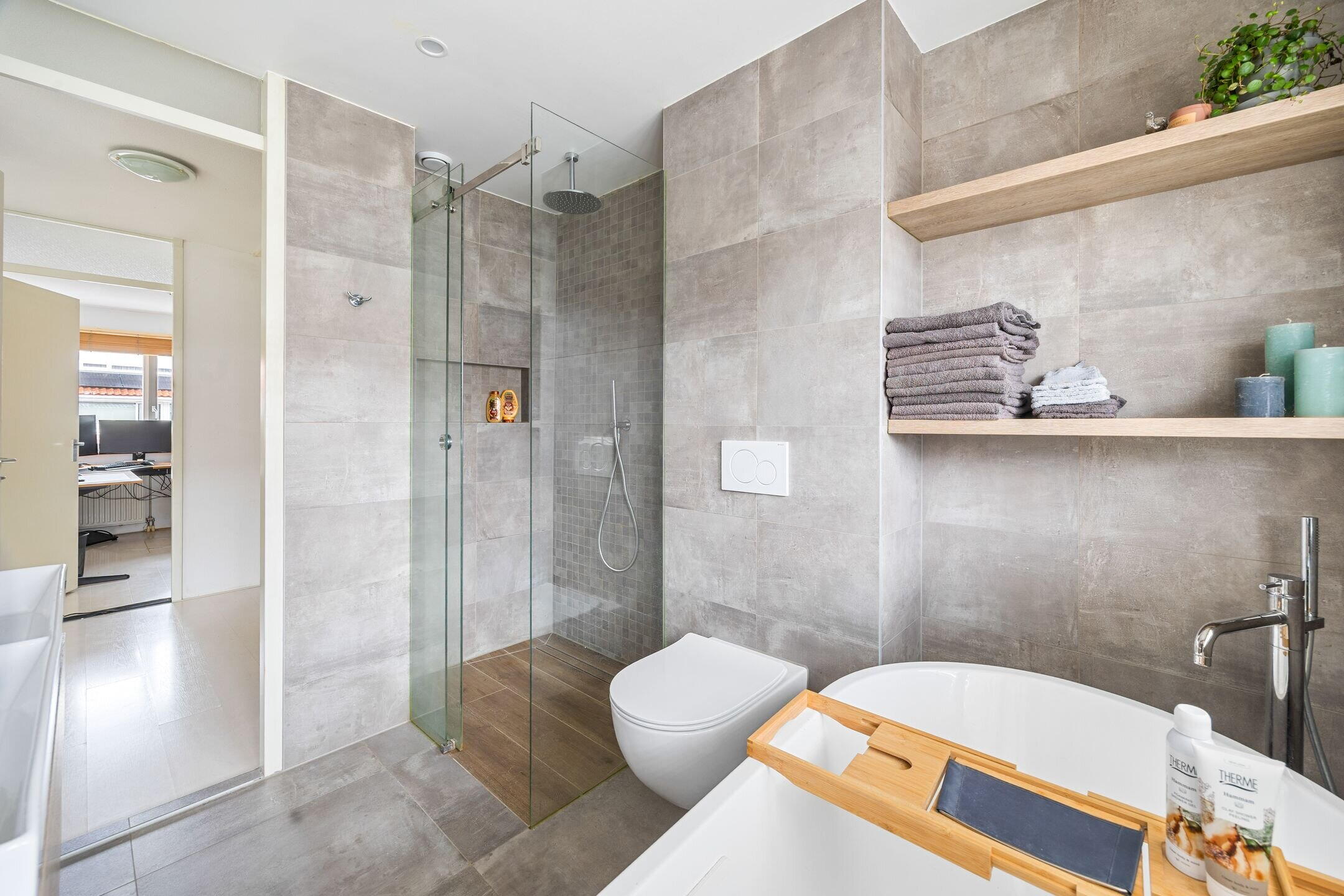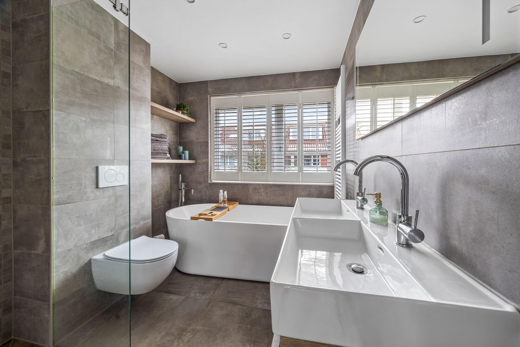 Naast de kamer aan de voorzijde u de (in 2020) volledig gerenoveerde badkamer. U geniet hier van een fraai vrijstaand ligbad, ruime inloopdouche met rain shower, dubbele wastafelmeubel met brede spiegel, houtlook legplanken, een designradiator en een zwevend, tweede toilet. De warme kleuren van de tegels contrasteren fraai met het witte sanitair.